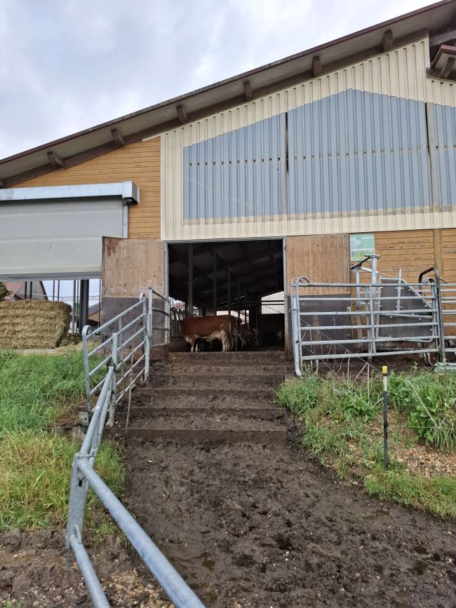 Teile des Jungviehs wurden bisher an einen Pensionsbetrieb abgegeben, welcher sich jedoch gezwungen sah, den Betrieb aufgrund der seit 2025 angewendeten Weidepflicht aufzugeben. Durch die Pacht eines benachbarten Jungviehstalls konnte Platz für einen größeren Rinderbestand geschaffen werden, die gesamte Nachzucht vom Absetzer bis zur Kalbin befindet sich so wieder am eigenen Betrieb. Unmittelbar an den Stall angrenzende, großzügige Grünlandflächen bieten dabei optimale Voraussetzungen für die Weidehaltung des Jungviehs. Der ständige Zugang zur Weide wird hinsichtlich der optimalen Fütterung durch die bedarfsorientierte Vorlage von Heulage im Stall ergänzt. Aufgrund der extensiven Bewirtschaftung des vorangehenden Pächters bieten die Flächen Weidefutter in mittlerer Qualität und eignen sich daher besonders für das Jungvieh. Staunasse Teilflächen sowie steile Hanglagen schränken Verbesserungsmaßnahmen im Grünland zusätzlich ein.