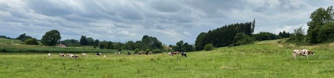 Als langjähriger Bio-Betrieb hat der Bioland-Hof Poppenhaus einen großen Erfahrungsschatz hinsichtlich der Weidehaltung von Rindern, die durch die Generationen hinweg stetig weiterentwickelt wird. Rund 12 ha arrondiertes Grünland stehen den 55 Kühen als Weidefläche zur Verfügung, die unter optimalen Bedingungen in wüchsigen Phasen auch gute Voraussetzungen für eine Vollweidehaltung bieten. Um die hohe Milchleistung gut ausfüttern zu können, wird im Stall eine TMR vorgelegt, die vom Weidefutter mit einem Rationsanteil von bis zu 50% ergänzt wird. In der Regel haben die Kühe zwischen den Melkzeiten die freie Wahl zwischen Stall und Weide, die sie in Abhängigkeit von Futterangebot und Witterung mal mehr und mal weniger intensiv nutzen.