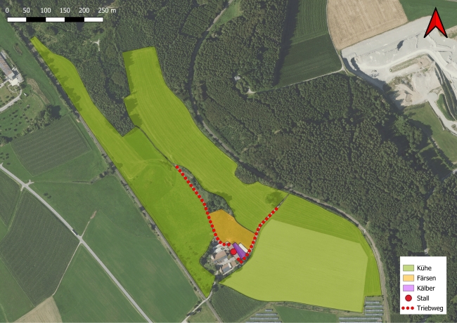 Witterungsschutz bieten Waldränder oder Feldgehölze, auf der hofentferntesten Fläche ein kleines Wäldchen. Zur Tränkwasserversorgung werden Quellen eingefasst oder schon vorhandene Leitungen genutzt.