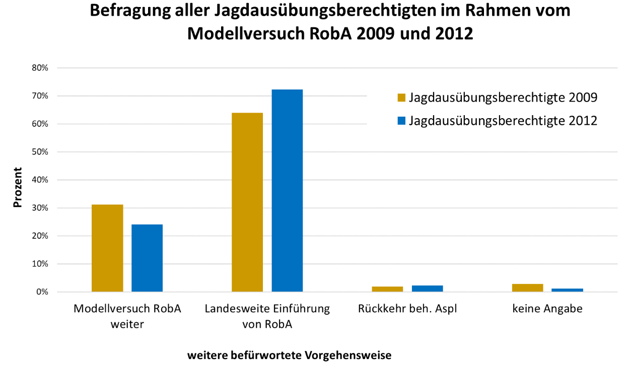 Der Modellversuch RobA hat gezeigt, dass ein Verzicht auf die häufig nicht zielführende behördliche Abschussplanung ohne Probleme möglich und für die Beteiligten mit zahlreichen Vorteilen verbunden ist. Die Abschaffung dieses bürokratischen Verwaltungsaktes setzte zusätzliche Ressourcen bei den unteren Jagdbehörden frei. Das jede Interessengruppe zu Beginn des Modellversuches vorrangig auf die Umsetzung eigener Ziele setzte, ist interessenabhängig verständlich. Entscheidend war der Lernprozess der Jagdrechtsinhaber, dass sie keine Fachexperten für forstliche und jagdliche Belange werden mussten, da das forstliche und jagdliche Knowhow bei Forstleuten und Jägern vor Ort vorhanden war, aber eine klare Priorisierung der eigenen Ziele eingefordert wurde.